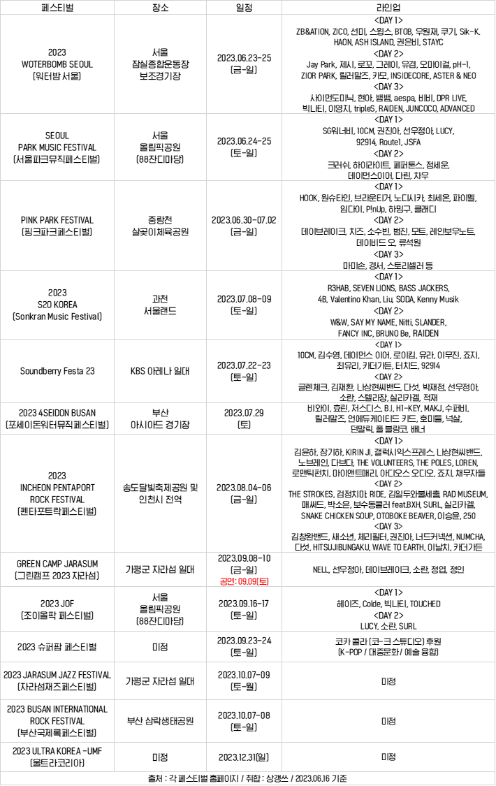 2023년 하반기 주요 뮤직페스티벌을 한 눈에 볼 수 있도록 요약해보았다. 2023년 6월 16일 기준으로 작성했으며, 라인업 및 일정은 추후 변동 가능성이 있다. 수도권 위주로 정리하긴 했는데, 부산에서 개최하는 굵직한 페스티벌도 포함시켰다.