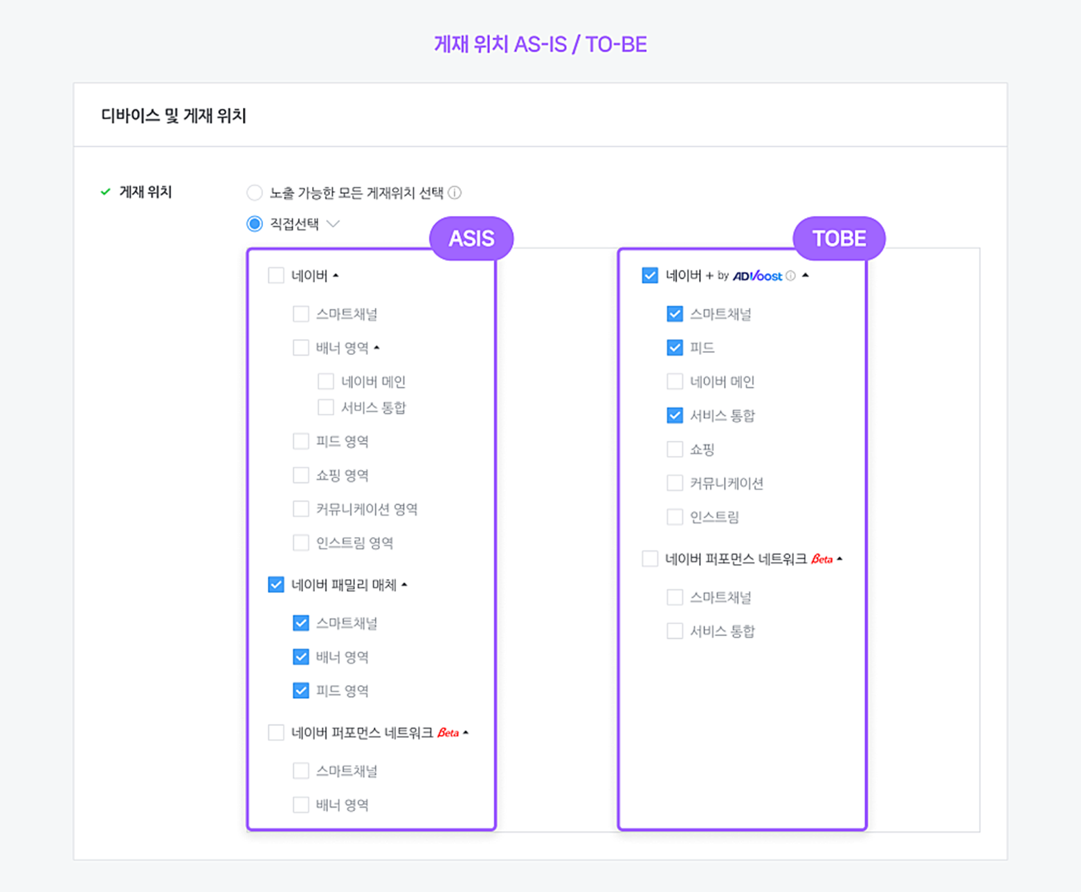 • 게재 위치 설정 UI 변경일자 이후에는 ‘네이버 패밀리 매체’ 및 그 하위 게재 위치를 단독으로 설정할 수 없다.