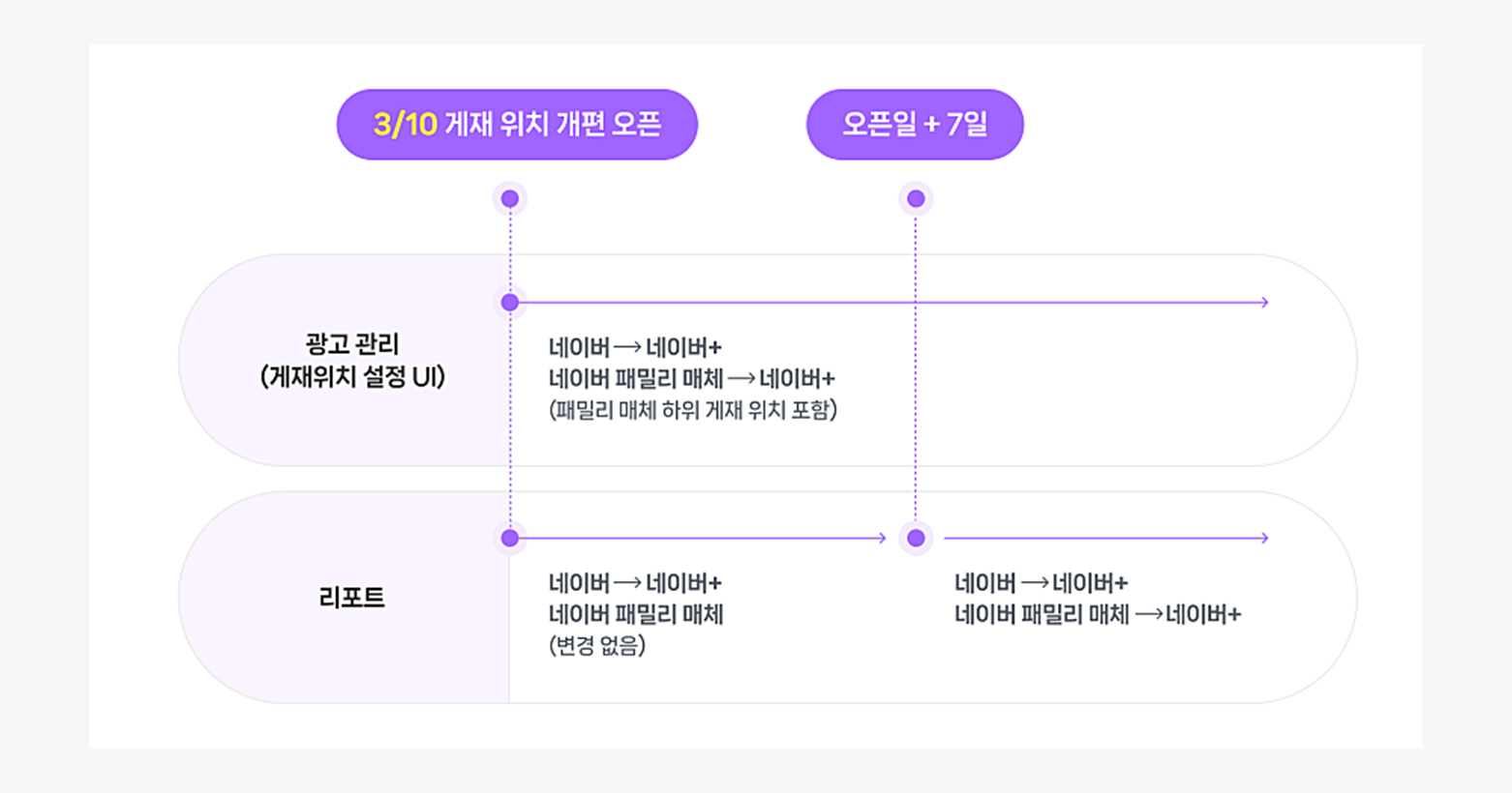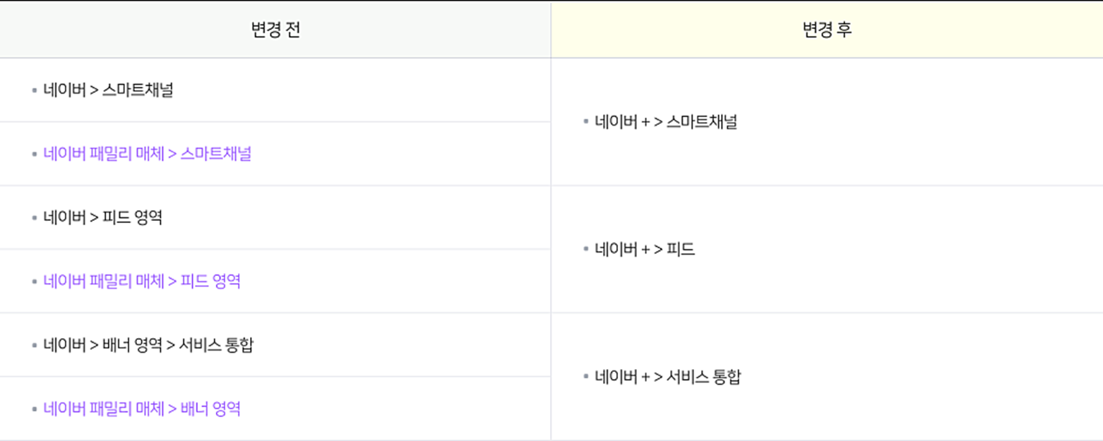 ‘네이버’ 및 ‘네이버 패밀리 매체’ 내 게재 위치가 ‘네이버+’로 통합됨에 따라, 게재 위치 설정 방식과 게재 위치 이름이 변경된다.