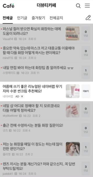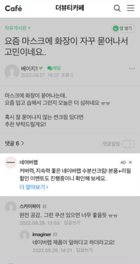 위 예시 이미지와 같이, 커뮤니케이션 애드는 네이버 카페에서 네이티브 광고 지면 형태로 노출된다.
