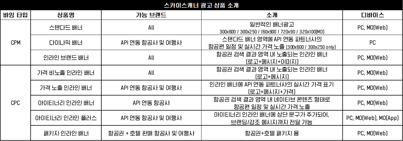 쉽게 설명하면 스탠다드 배너 영역에 API 연동 파트너사의 항공편 일정 및 실시간 가격 노출이 노출되는 광고이다.