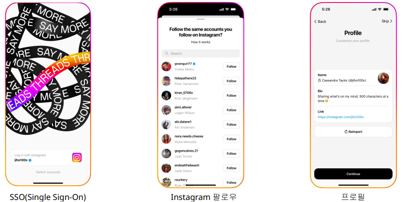 - SSO(Single Sign-On) : SSO를 적용하여 인스타그램 계정으로 스레드에 로그인 가능하다.
