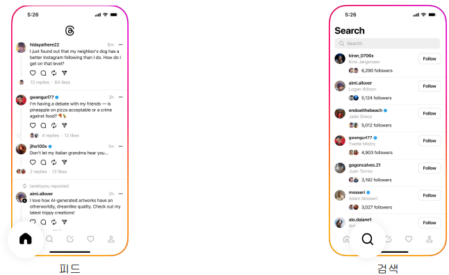 인스타그램에서 출시한 서비스다 보니, 인스타그램에서 사용하던 사용자 이름과 인증 배지를 Threads에서 그대로 사용할 수 있다. 인스타그램에서 자신이 팔로우하거나 자신을 팔로우하는 계정을 한눈에 볼 수 있기에, 인스타그램 유저들이 쉽게 시프트할 수 있도록 유도했다.