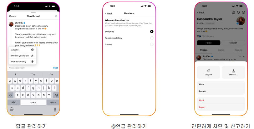 - 차단 및 신고하기 : 간편하게 차단 및 신고가 가능하며, 인스타그램에서 차단된 계정은 Threads에서도 그대로 차단되므로 이미 차단한 계정을 다시 차단할 필요가 없다.