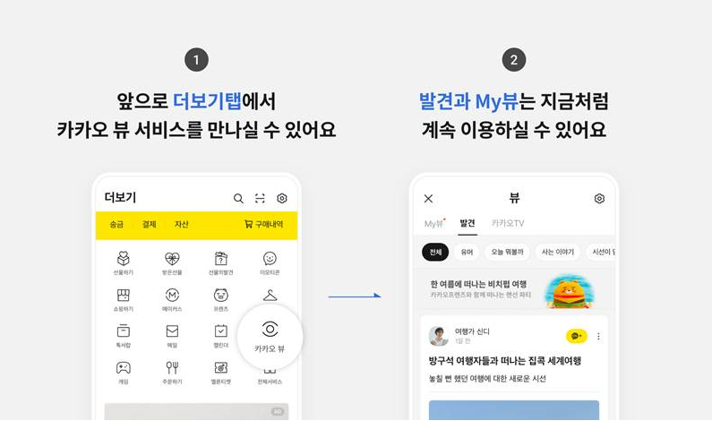 기존 카카오톡의 뷰탭을 통한 진입점이 제외되고, 카카오톡 더보기탭에 뷰 서비스 진입점이 추가될 예정이다.