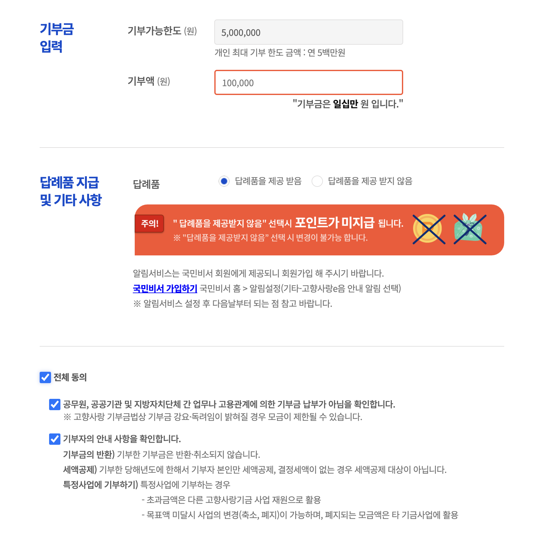10만원 기부하면 10만원 돌려받고 3만원 답례품까지 돌려받을 수 있어요